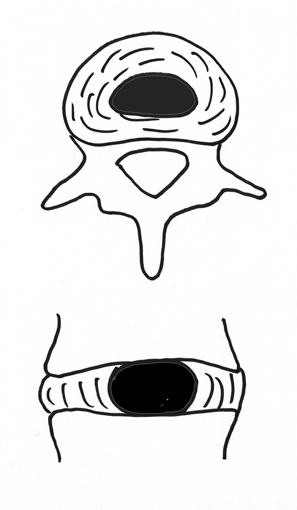 De wervels hebben aan de achterkant bogen. Doordat de wervels gestapeld zijn, vormen die bogen een lange holle buis waar het ruggenmerg doorheen loopt. Het ruggenmerg is de bundel van zenuwen die motorische signalen uit de hersenen naar beneden vervoert (opdrachten zoals: til de voet op) en sensorische signalen weer naar de hersenen (gevoel, pijn). Tussen elke twee wervels komt aan weerszijde een zenuw tevoorschijn uit het ruggenmerg vandaan. Ze lopen naar armen, romp en benen en zorgen voor beweging (motorisch) en gevoel (sensorisch). Elke zenuw heeft ongeveer een vast traject en een vast verzorgingsgebied. Als iemand met een klapvoet binnenkomt dat weet men dus dat dat kan komen door inklemming van zenuw L5.